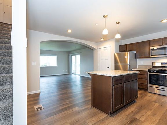 This spacious 2-bedroom, 2 bath townhouse with an attached garage offers an open floor plan designed for modern living. The gourmet kitchen is a standout, featuring a large island, stainless steel appliances, gas range, built-in microwave, and elegant tile countertops with matching backsplash.