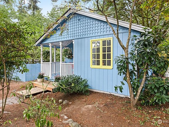 Classic vintage Vashon cottage located in friendly Bethel Park has a sweet west-facing front porch to watch the sunset. Doors open wide to let the outside in. The cozy living room has a propane stove with a hand-cut slate hearth. The well-lit kitchen with breakfast bar has custom Art Nuevo tile, propane cooking, and a pantry with vintage doors and knobs. One bedroom with an attached 3/4 bath. Half-bath has a W/D. Step outside to the large back deck and enjoy the quiet yard with a fire pit, pond, and garden space. The inside/out/ flow is perfect for entertaining. 525 sq ft of garage is a shop, studio, music room, bedroom, or endless possibilities. Close to town, northed ferry, and Shinglemill and Fern Cove parks.