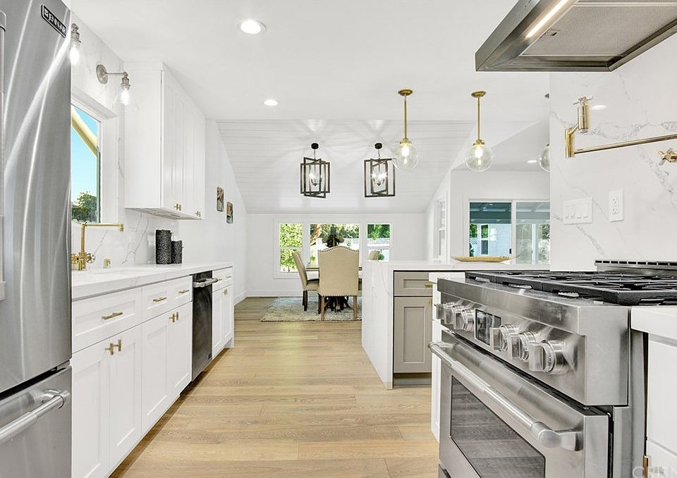 Upscale 2018 Expanded Remodeled Ranch Style Home with 4 Bedrooms and 2.5 Baths with approximately 2000 Square Feet of Living Space with Open Floor Plan in Desirable Sherman Oaks. Gourmet Kitchen with Jenn-Air Stainless Appliances with Free Standing 6 Burner Range with Convection Oven and Matching Dishwasher and Refrigerator, Built-in Microwave, White Quartz Countertops including Waterfall Edges and Full Backsplashes, Center Island with Bar Seating, and Two-toned Custom Cabinets. Large Dining Area off the Kitchen with Vaulted Ceiling with Wide Plank MDF Ceiling Detail. Spacious Living Room Open to Dining and Kitchen with Sliding Glass Doors to Patio and Backyard. Master Suite with Custom Wide Plank MDF Wall Detail, Walk-in Closet with Custom Organizers and Sliding Door Access to Backyard. Sumptuous Master Bath with Dual Vanity, Freestanding Soaking Tub, Frameless Glass Full Slab White Quartz Shower, and Oil Rubbed Bronze Fixtures. European Styled Hallway Bath with Carrera Marble Flooring, Dual Sink Vanity and Tub/Shower with Frameless Glass. Wide Plank European Oak Flooring throughout home. Lush Backyard with Covered Patio. Finished Drywalled Garage with Epoxy Floor. Kester Avenue Elementary Subject to Availability.