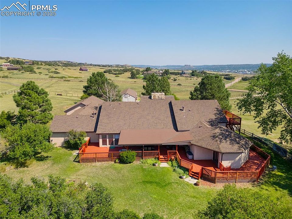 This extraordinary 10.2 acre horse property offers a combination of panoramic beauty, luxurious living & equestrian functionality. The elegant 6,322 sq. ft. ranch style home features 7 spacious bedrooms, 5 bathrooms and an oversized attached 4-car garage. On clear days you'll enjoy 365° views stretching from Castle Rock to Pikes Peak. Resort-style amenities abound, including a stunning swimming pool with 3 cascading waterfalls & a whimsical "Flintstone" diving board made of natural rock, a gas firepit & a hardwood deck that is mostly covered. The deck wraps the back & eastern side accessible from the primary bedroom, living room, kitchen, sunroom & wet bar offering year-round enjoyment & peaceful views. The fully fenced and cross-fenced land includes two corrals, an 8 stall barn complete with tack room, a hay drop, plus a work shop & detached two-car garage ideal for storing ATVs or equipment. This is the perfect property for enjoying a sunset ride on your horse. Inside, the home immediately impresses you with a vaulted 20 x 30 living room & a dramatic 20-foot stone wood-burning fireplace, skylights, Italian tile & natural wood flooring. A unique second-story loft featuring a wet bar extends to overlook the living room, adding charm and entertainment appeal. The beautifully appointed kitchen features granite countertops, custom cabinets, gas cooktop & marble tile flooring. All stainless steel appliances & washer/dryer are included. Just off the entry is a spacious pool room w/double doors to the outside & offers flexibility as a formal dining space or entertainment hub. The main-level primary suite includes French doors to the deck, a luxurious jetted bath & a cedar closet. In addition, there is a generous 24' x 28' family room w/vaulted ceiling which provides ample space for media, games, or gatherings. It's a true Colorado gem designed for comfort, recreation & adventure! This home delivers an unmatched lifestyle for horse lovers & luxury seekers alike.
