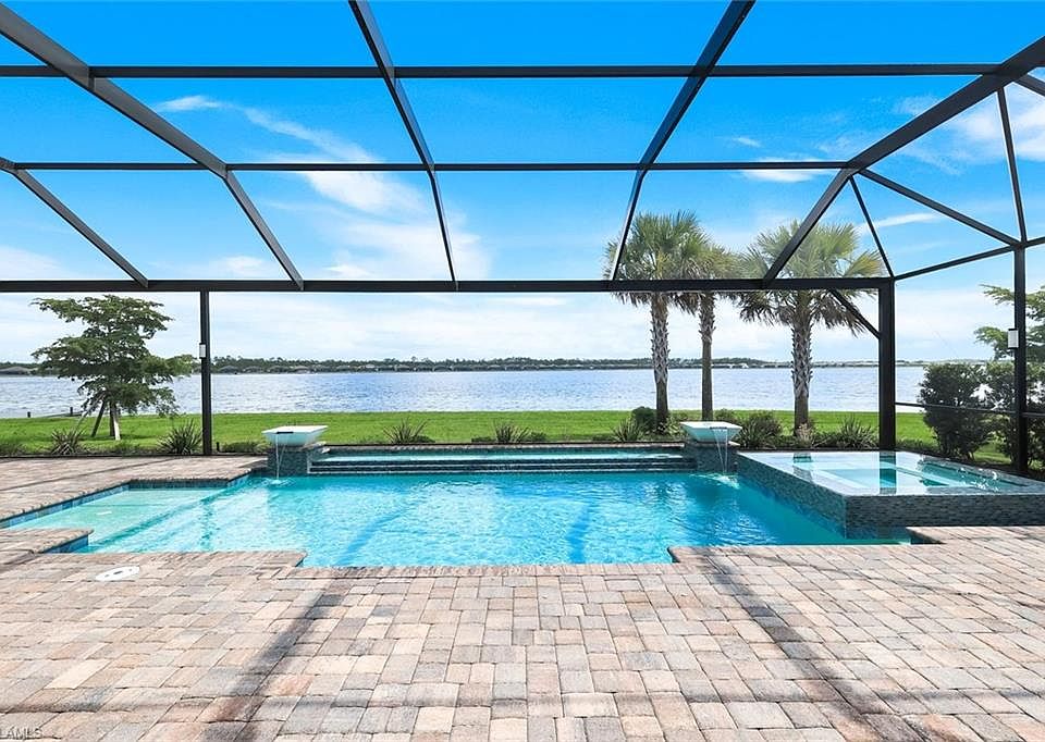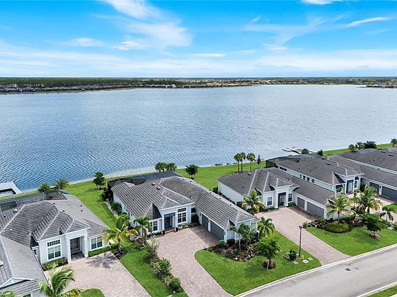 "Simplistic elegance" are words used by the seller to describe this 3 bedroom 3 bathroom, 3 car garage waterfront home. The magnificent "Bougainvillea Model" is a true masterpiece. The floorplan flows smoothly through the exquisite upgrades. From the tankless water heater to the RO system in the kitchen which also connects to the refrigerator, just a part of the GE Monogram appliance package. The entire home has wood-like tile flooring. Great room has built in cabinets that house the TV that ascends and descends with the push of a button. Upgraded light fixtures throughout from Hubbardton and Forge or the Lamp Shop of Naples. Main suite has view of the lake and pool, two walk in closets, double sink vanity and shower with large seat, 1 of 2 toto double flush smart toilets. The 9 bladed paddle fans on the lanai also run on remote control and keep it cool by the outdoor kitchen. You often hear, this one is a must see, but this time its true. Looks better than the pictures. The views are incredible! Room for a dock if so desired. Has an ADT Security System, high ceilings and world class amenities.