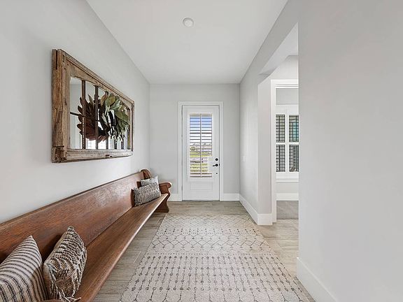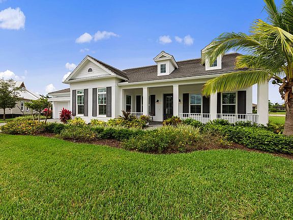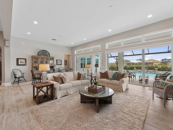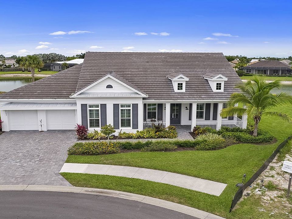 Premium oversized lot with 193' of Waterfront & Southwest Exposure. Coastal Farmhouse open floor plan with 12' ceilings perfect for entertaining. Ashton Woods Majorca model. 4 beds, 3.5 baths, 3-car tandem garage with epoxy floor and impact glass windows. Custom heated saltwater pool/spa, Panoramic screen cage and pool bath. Wall to wall dual open sliders. Wook-look tile floors. Spacious great room with shiplap wall details, custom decorative corbels & coastal trim on all windows & sliders. Gourmet kitchen, white Shaker cabinets, upgraded leather finish granite countertop, stainless steel appliances, walk-in pantry. Huge master bedroom. Master bath with 2 separate vanities, walk-in shower & 2 large walk-in closets. Guest bedroom with ensuite bath & 2 additional bedrooms with Jack-n-Jill bath. Security system. Laundry with cabinetry and sink. Plantation shutters throughout. Many Club Amenities include 5,000sqft resort style pool/lap pool, cafe style restaurant, tiki bar, beach area, dog parks, playground, bocce ball, fully equipped gym/yoga room, tennis, pickle ball, bike/walking trails and 1-mile row lane. Low HOA fees!