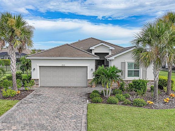 BEST VALUE IN HARBOR WEST! Enjoy the largest interior lot in the community that is completely FENCED and has a HUGE BACKYARD. This 4-bedroom, 3-bathroom home boasts a HEATED POOL & SPA, an EXTENDED LANAI and an already large patio that is perfect for relaxing and enjoying the serene LAKE-VIEW while sitting by the pool. The home is fitted with IMPACT WINDOWS AND SLIDERS that grant FULL HURRICANE PROTECTION but also give you the benefit of never having to worry about putting up or taking down any hurricane shutters. Enjoy the convenience of a TILE ROOF that typically last much longer than a standard shingle roof and gives the home a Mediterranean style look. Inside you'll find a spacious open-floor plan with a split bedroom layout outfitted with 12x24 throughout the home and beautiful granite countertops across all of the countertops in both the kitchen and bathrooms. The charming upgraded white kitchen features a large island for an informal dining space, a large pantry, and stainless-steel appliances. The primary bedroom is ample in space and comes with two big-walk in closets. The primary bathroom comes complete with his and her sinks and a large shower with a Kohler Artifacts Hydro rail system with a rain head attachment or a handheld attachment for your showering pleasure. The 2nd bedroom is also very spacious and is positioned in a private part of the home away from the other bedrooms and comes with its very own on-suite bathroom. The front wing of the home comes with two more well-sized bedrooms that can be used for a variety of things besides just a bedroom, maybe a den, office, workout room, etc. The front wing comes with its own convenient bathroom. Great for guests or for quick use. The large laundry room is located just off the 2-car garage and is outfitted with 42' soft close cabinets. Underrated features include charming plantation shutters on the interior of all the windows, elegant lighting and upscale fans, Koehler faucets in master bathroom and matching towel and toiletry bars in all baths. The brick paver patio has been maintained and resealed to increase its longevity. The paver driveway is large and wraps around to the air handler. The home has a nice screened in entryway with decorative front shutters. The whole house has gutters around it. Gray plank tile throughout and a warm light neutral gray interior lends the perfect backdrop for your designer inspirations. This is located in Harbor West which is a GATED COMMUNITY with NO CDD FEES. The lawn Maintenace and irrigation is taken care of by the community. This property is not one that you'll want to miss. BE SURE TO VIEW THE 3D VIRTUAL TOUR ON ZILLOW. Don't forget the close proximity this property has to both Manasota Key Beach and Englewood Beach as well to Restaurants, bars, grocery stores, medical offices. Tampa Rays and Atlanta Braves play Spring Training nearby every year. You won't be disappointed with this located! This home has NEVER FLOODED, and a Survey and Elevation Certificate are available. Call your agent to book your showing today!