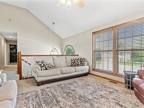 Beautiful split entry home on cul-de-sac with exceptional location to local schools, convenience stores and highway access! Spacious vaulted great room features a gas fireplace and multiple large wall windows to the kitchen area for ideal entertaining functionality. Kitchen is fully equipped with stainless steel appliances, hardwood floors, vaulted ceilings, kitchen island, and large dining area with access to the beautiful raised sundeck! Ceiling fans are featured in every room for added convenience. Primary bedroom has a vaulted ceiling try and luxury bath with double vanity, vaulted ceilings, jetted tub with overhead shower and walk in closet. Fully finished walk out lower level doubles entertaining space with it's secondary living room, two additional bedrooms, full bathroom, storage, and laundry room with carpeted walk in closet! Enormous backyard is perfect for outdoor entertaining with the raised sundeck, covered patio and beautiful backyard with playlet and open fields backing the yard for added privacy.