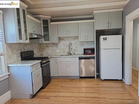 This beautifully remodeled home features all of the extras. There are gleaming wood floors, a stylishly remodeled kitchen plus two fully updated bathrooms, including one en-suite. The secure and gated front yard is shaded with a mature tree and is a bonus not typically found in the area. There is a detached garage with two separate bays as well as a dedicated bonus room. There are several bus lines nearby. The vibrant Fruitvale shopping and BART plaza is only several blocks away.