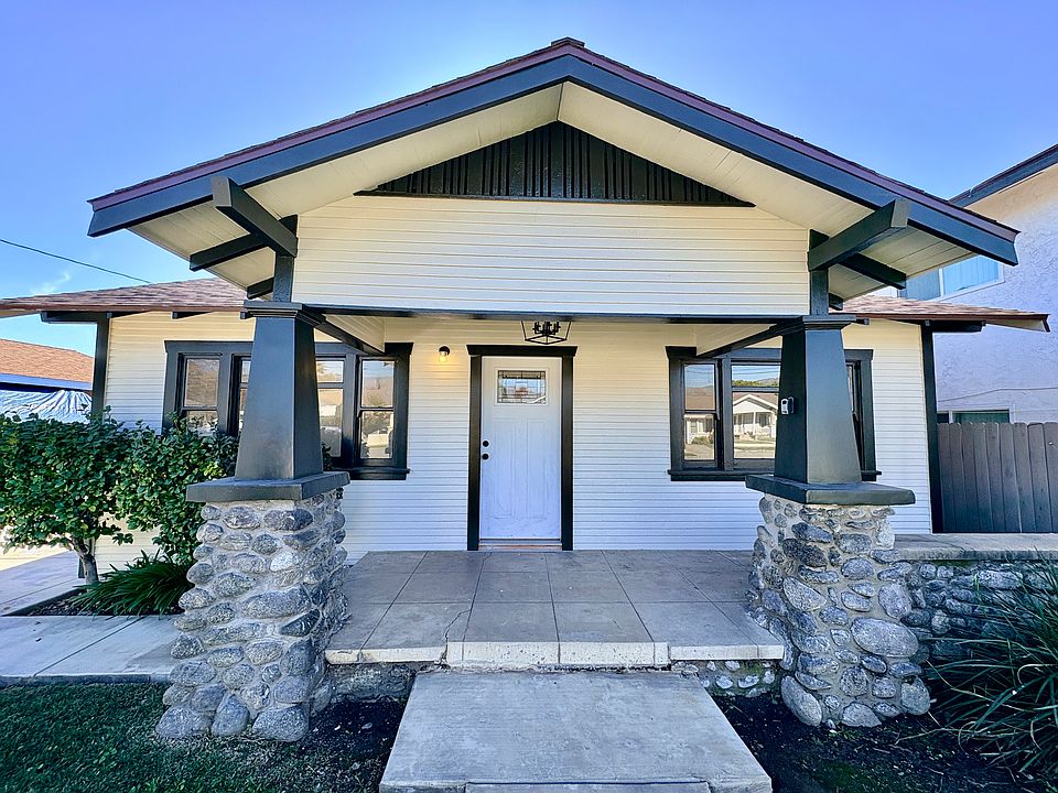 Charming Home with Gable-Style Porch * 3 Bedroom, 1 Bathroom home. A short 15-minute walk to Downtown La Verne for shopping, coffee, dining and more * NEW Luxury vinyl plank flooring throughout, NEW two-toned paint throughout. Kitchen with white shaker style cabinets, Quartz countertops, Gas range and Microwave. Living room with built in shelves. Stackable washer and dryer included without warranty. NEW SPLIT AC units in bedrooms. Driveway parking only.