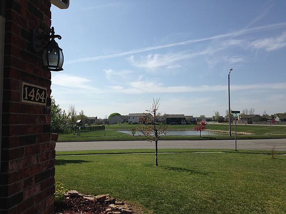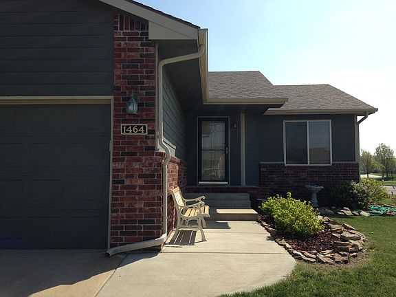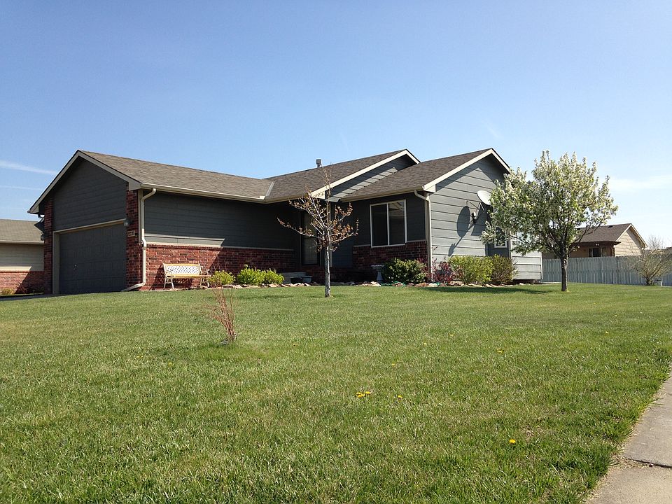 Nice one story home with 3 bedrooms and 2 bathrooms and basement on a corner lot! Wonderful location in Seasons 3rd Addition in Goddard. This home has a beautiful view of the neighborhood lake with a walking path right next to the house. There is also a playground in walking distance in the neighborhood! The main level of the home features vaulted ceilings and a fairly open floor plan. The kitchen has an eating bar, built in microwave, and a reverse osmosis water filter. The stainless steel dishwasher, smooth top electric range oven, and microwave stay. The attached dining area has sliding glass doors to the back patio. The master bedroom on the main floor has door access to the full bathroom with a tub and shower and a walk in closet. Main floor laundry. In the basement you'll find a family room, a third bedroom, and an updated bathroom with tile surround. New roof in 2017, a well on property, and sprinklers. The carpet is 3 years old.