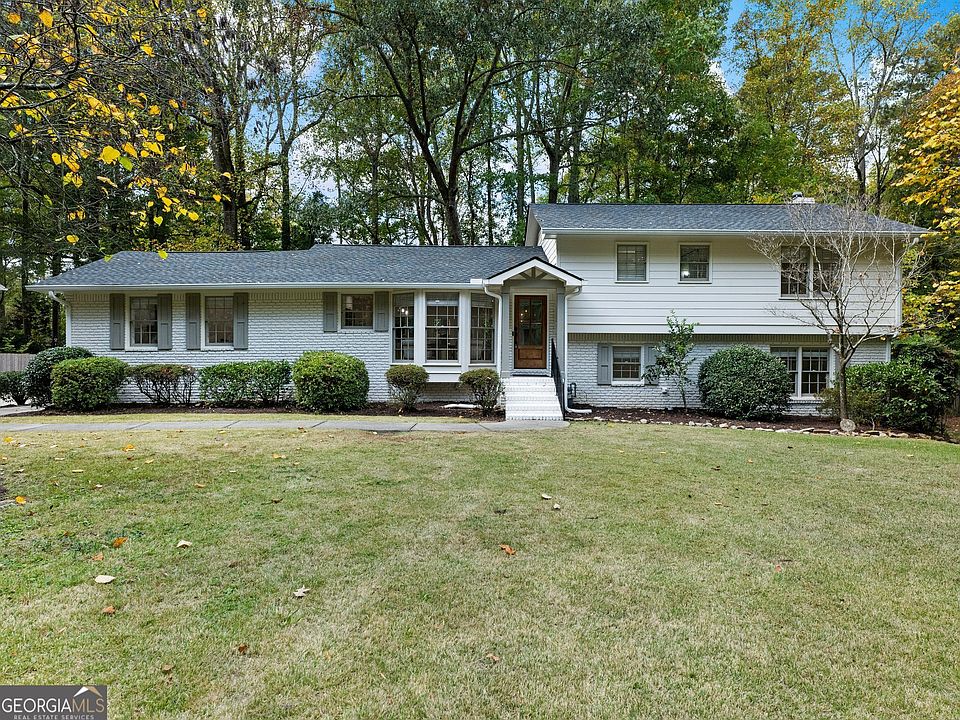 This amazing split level renovation has 4 bedrooms, 4 full bathrooms with 2 car detached garage in sought after Chateau Woods! With high end finishes throughout the home, this home is the perfect combination of a classic split level Dunwoody style home with a new modern farm house touch. The main level has brand new kitchen with high end appliances, open concept, new hardwood floors on entire level, wet bar with custom shelves, brand new roof and a beautiful great room with vaulted beamed ceilings and gas fireplace. The top level has one of two potential owner's suites and one secondary bedroom with hall full bathroom. Bottom level has 2nd potential owner's suite with massive bathroom and one additional bedroom and full hall bathroom. If you love to entertain there is a beautiful brand new deck off the main level and kitchen to enjoy the great Georgia weather and private wooded backyard.