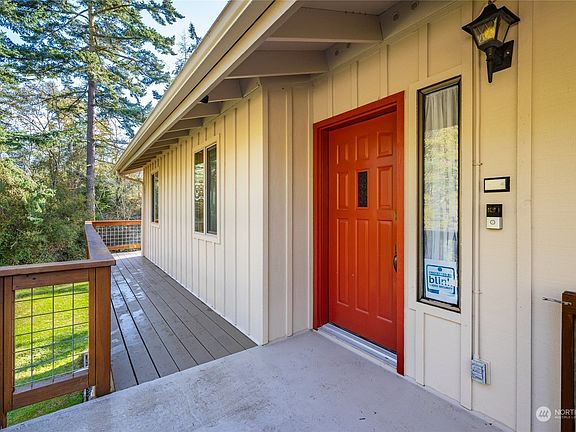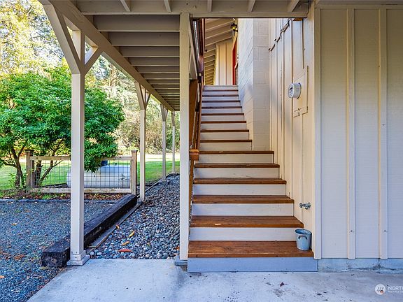 Charming custom home in the rain shadow w/huge wrap-around entertaining deck & beautiful sunroom! Enjoy the gated, private +/-2.2 acres level, no CCRs, 864asf detached shop w/power & w/private well. Delightful open concept living room w/vaulted ceilings, accent T&G wall, picture windows, propane fireplace & lovely sunroom! Kitchen: Corian counters, updated SS appliances, solid wood cabinetry w/pullout shelving. Large primary: updated bathroom, accent T&G wall, sliders to deck. Powder room & mud room w/custom cabinetry open to upper deck. Lower level: charming family room w/wood stove, sliders to covered patio. Addtl 2 bedrooms, bonus room & full bath. Large laundry w/glass door to patio. Metal roof, newer covered gutters, updated heat pump.