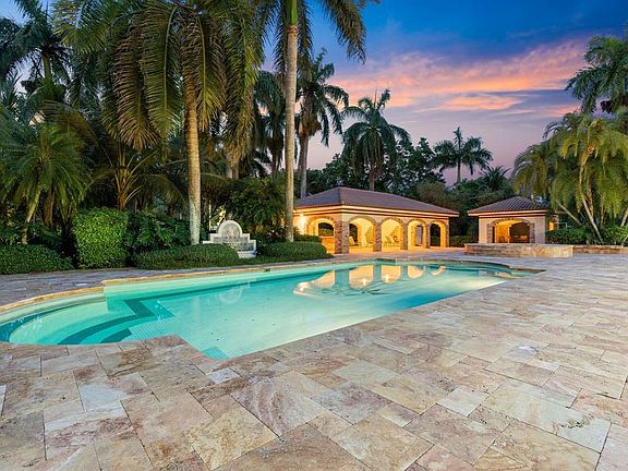 Set on a private 2.34-acre estate in the heart of Sunshine Ranches, this stunning property offers luxury, space, and tranquility. Surrounded by lush landscaping, paved walkways, and a peaceful waterfall pond, it feels like a true Zen retreat. The 5-bedroom home includes an office, maids quarters, and 4.5 bathrooms, featuring marble floors, a bamboo-floor family room, and elegant living and dining areas with a fireplace. Entertain with a custom billiard and bar area or cook in the chefs kitchen with an oversized island and high-end appliances. The grand primary suite offers dual spa baths and his-and-hers closets. Outdoors, enjoy a resort-style pool and spa, two gazebos, a lighted tennis court, and complete privacy surrounded by nature capturing the essence of South Florida luxury living