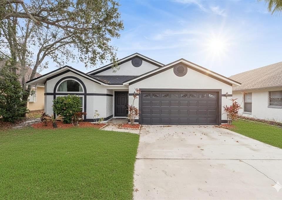 One or more photo(s) has been virtually staged. This fully refurbished 3 bed, 2 bath single family home in popular Hunters Creek has been pre-inspected (please ask for the Inspection report) and comes with a Home warranty. This privately located home with long drive, backs up to a lake with conservation behind that. An open plan design with vaulted living areas and split plan bedrooms seems much larger than the square footage suggests. New ceramic tile floors through all living and wet areas, and brand-new carpets in the bedrooms (2025). Newly updated kitchen and both bathrooms, new roof (2024) and new windows & sliding doors (2024). Whole house was replumbed (2023) and new water heater (2023). New AC was installed in 2021. Irrigation and French drain installed in 2020. Brand new fence installed 2025. Enjoy convenient living as your first home, your last home, but make it your NextHome. Move-in ready worry free home! Picture yourself sitting in the covered & screen lanai enjoying your beautiful Florida mornings, or relaxing during the evening! This home is perfectly situated within easy walking distance to A-rated schools, parks, trails, shopping and restaurants, and close to all main commuter routes. The Listing agent has an ownership interest in this property; and will be a part of a 1031 exchange (this does not affect you as a buyer of this home)!