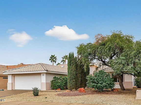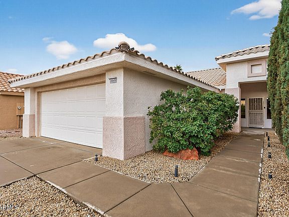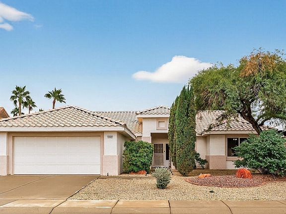 SO MUCH TO OFFER IN THIS EXPANDED FLAGSTAFF! The kitchen is huge, with a ton of counter space, cabinets, newer stainless steel appliances (gas stove), eat-in breakfast area and long eat-up counter. PRE-PAID SOLAR LEASE through 2032. Roof underlayment was replaced in 2012 under the solar panels and the rest was replaced in 2016. Very spacious feel to this home, with a separate den, spacious primary bedroom, EXTENDED GUEST BEDROOM - 10.5' X 15.3' & Utility/hobby room. The kitchen is open to the living/dining room. A built-in entertain wall, highlights the living room and a Waterford chandelier (included) hangs in the dining room. Primary bedroom has a pop-out bay window, en-suite bath with dual vanities, walk in closet and custom remodeled, walk-in shower with a built-in bench seat. The guest bathroom has updated faucet and light fixtures with a tub/shower combo. South facing backyard is fully fenced, has mature desert landscape and screen enclosed back patio. EXTENDED 2.5 GAR GARAGE measures 21' wide by 25' deep and has plenty of space for 2 cars and tandem golf cart storage. Plenty of garage storage with attached cabinets and pull down ladder leading to a storage loft. Utility sink and Whirlpool frontload W/D in the garage (included). Flow-Tech water treatment system was installed. HVAC was replaced in 2013, Water heater in 2015. Pre-paid solar lease through 2032 with a new Tesla Inverter in Nov 2024. This house offers a TON of value for the space and amenities! Fun Fact: The seller/original owner states that this was the first Flagstaff to be completed and sold in SCW. Seller chose to add the additional extensions wherever offered by the builder, at the time of the original construction in 1996 increasing the size from a base Flagstaff.