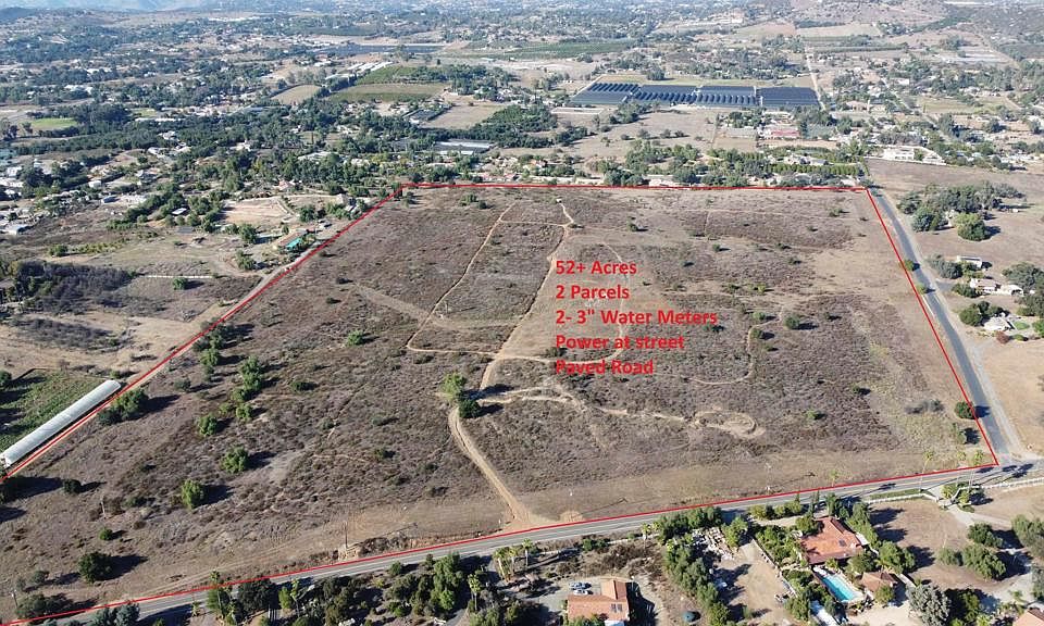 Fantastic opportunity to own a large piece of land (52.82 Acres) in the heart of valley center with the potential to go in various directions. It consists of 2 parcels with easy paved access along Vesper Rd, 28.96 Acres on the south parcel and 23.86 acres on the North parcel. There is power and cable along Vesper rd. and both parcels have a 3 Inch water meter. The lot is very accessible and central to the expanding town, with schools nearby as well as the upcoming supporting services. General plan designation is SR-2 (Semi Rural Residential), Use Regulation is A70 (Limited Agriculture; Intended for crop or animal agriculture), and the animal Designator code is L (see animal regs), building type is C (Single Detached, 1 dwelling unit per lot). Minimum lot size zoned is 2 Acres. Per VCMWD current capacity costs (see attached doc) 3 inch water meters are listed at $117,403 plus $10,444 installation fee, totaling $127,847 per meter (parcel includes 2). Water district states they can give credit to be converted to residential; if splitting parcel in to various lots that can also be accommodated resulting in substantial savings.