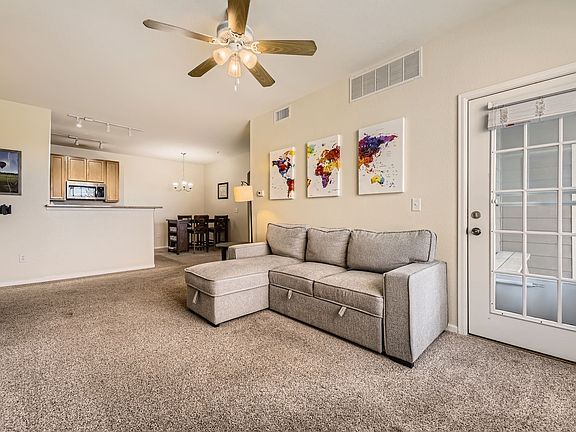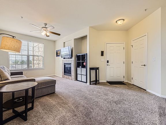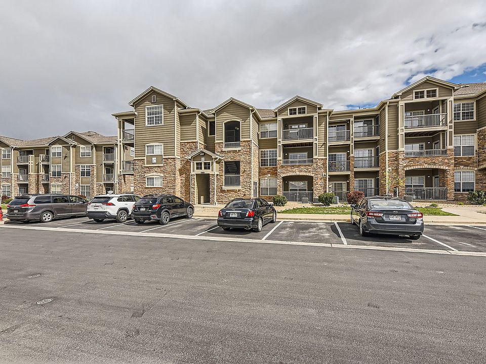 Welcome home to the beautiful resort-style community of Blue Sky at Vista Ridge! This second level 2 bed/ 1 bath condo invites you in with a cozy gas fireplace and 2 south facing balconies, perfect for relaxing and enjoying the stunning Front Range sunsets that Erie has to offer! Come home into your open concept living, dining and kitchen space, ready for a quick and immediate move-in. Your new home also features 2 spacious bedrooms with the primary suite boasting a large walk-in closet and its own private balcony! The home's full bath is showcased by a blissful Roman tub and an extended granite countertop vanity. The in-unit laundry closet with included GE washer and dryer also offers additional shelving storage, while a dedicated storage closet can be found on the balcony as well. Head down to the clubhouse to discover your oasis near the mountains. Perfectly equipped with a fitness room, pool and hot tub, your home is the best place for your own staycation! Nearby Castle playground features covered picnic tables and a sand volleyball court, ready for additional outdoor entertaining with friends and family. Minutes from the Colorado National Golf Club, fantastic dining in Old Town Erie and Lafayette, Dutch Brothers, and miles of biking trails, come discover all that Blue Sky has to offer