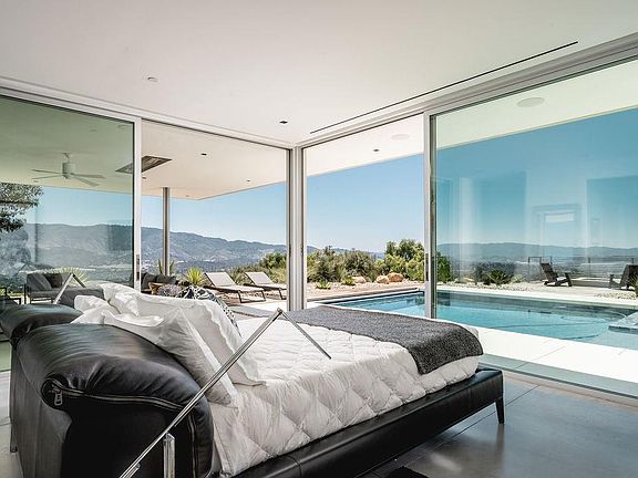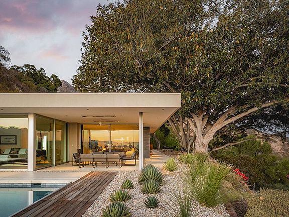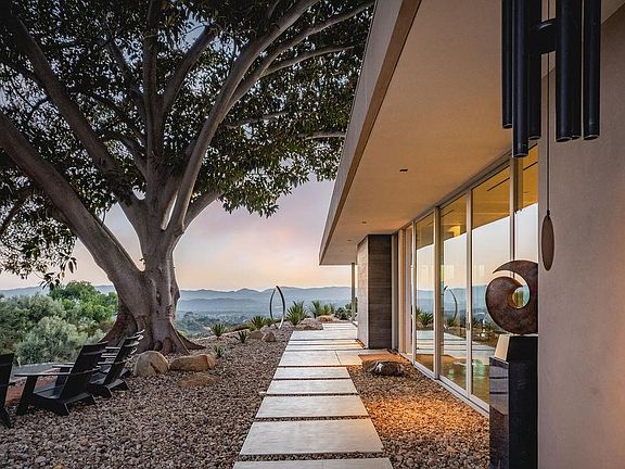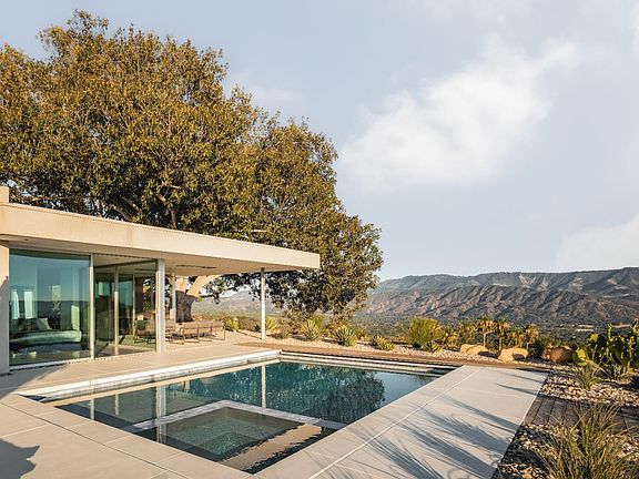 The Glass House! Perched along Ojai's iconic Foothill Road, this architectural retreat is a sanctuary of light, glass, and Zen-like serenity, an exquisite union of design and nature. Built in 2017, the single-level home spans 3,154 sf with walls of glass that dissolve the boundaries between indoors and out, framing an expansive 270-degree view of mountains, valley, and sky. Minimalist yet inviting, the interiors balance polished concrete floors with sculptural quartz surfaces, complemented by the landscape's organic beauty, inspiring both stillness and creativity. Re-envisioned in 2022, the property was elevated with a 1,117-sf Pavilion, a modern addition featuring showcase-style parking with a private yoga and fitness studio, sauna, an inspired space where wellness and architecture converge. The main home transformation also added a media lounge and a fourth bedroom, enhancing versatility while preserving refined elegance. Two additional dwellings enrich the sense of retreat: a creative atelier, ideal for quiet work or writing, and an intimate leisure cabana, welcoming meditation, wellness, and relaxation. Together, these structures form an inspiring compound designed for reflection, connection, and balance. Set upon 1.87 acres shaded by magnificent Moreton Bay fig trees, the grounds unfold like a living canvas: a sparkling pool with spa, sun-dappled decks, a Tuscan-inspired courtyard for al fresco dining, and fire-lit terraces where Ojai's legendary Pink Moment illuminates the horizon. From nearly every vantage point, the views are transcendent: fog drifting over ridges, sunsets spilling gold across the valley, and starlit nights that feel infinite. More than a home, this is a glass-walled sanctuary in the treetops, an architectural jewel and meditative Zen haven, offering one of Ojai's most extraordinary perspectives. One Of A Kind!