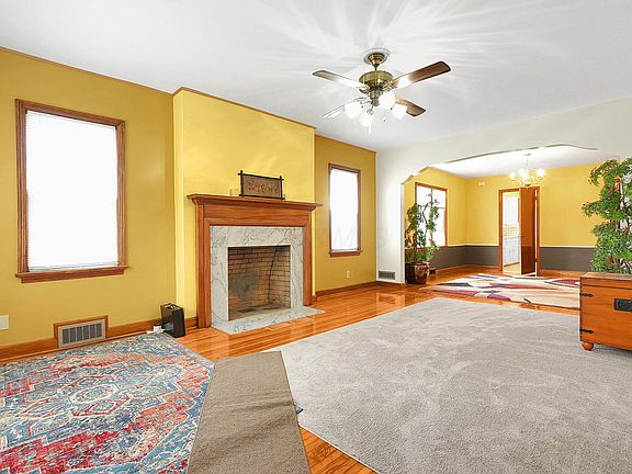 Charming home with many mechanical updates, great rear, fenced yard, and covered patio. Newer roof/vinyl siding, stone facade. Beautiful hardwood floors throughout the main floor, decorative fireplace with oak mantle. Remodeled kitchen with quartz countertops, subway tile backsplash. Unique ''fold down'' table with built in seating, charming architectural 1930's touches: door arches, built-in storage. Two large bedrooms on main floor, remodeled bath with single sink, tub with tile surround. Upstairs, large, cape cod style bedroom, carpeted floors. Rear yard is fenced, detached garage for additional storage, covered rear porch. Solar panels have drastically cut down owner's electric bills.