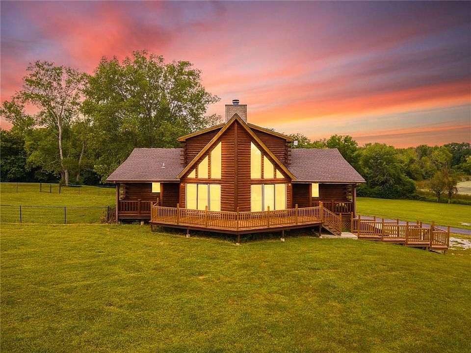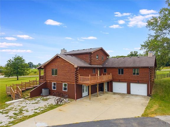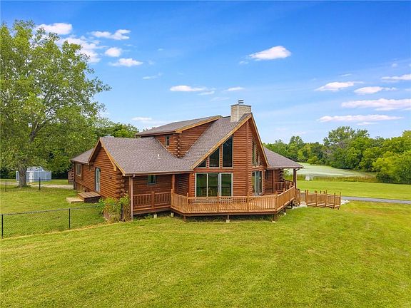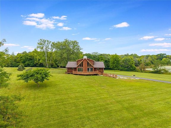 Escape to your own private retreat on 8.78 acres overlooking a 3-acre stocked pond with a perfect mix of woods and pasture. This custom-built insulated log cabin offers both rustic beauty and energy efficiency, showcasing hand-carved stairs, soaring vaulted beamed ceilings, a gorgeous deck, and a dramatic two-story stone fireplace that anchors the heart of the home. There's even potential for a second apartment in the walkout basement.