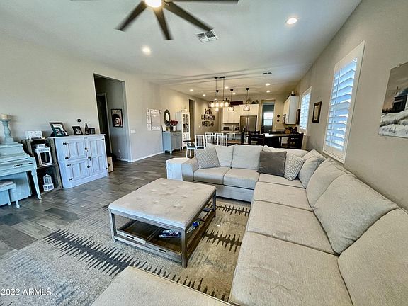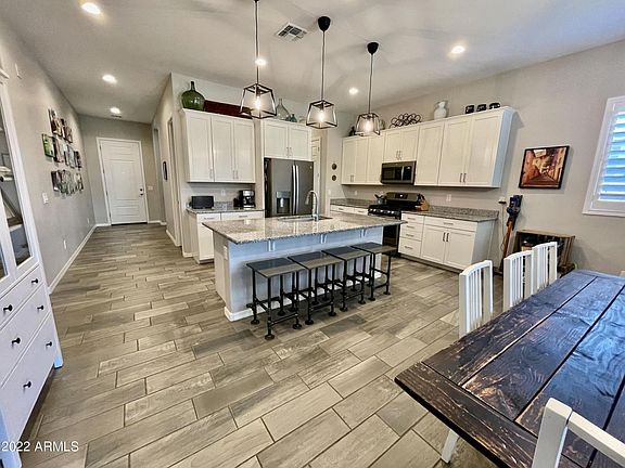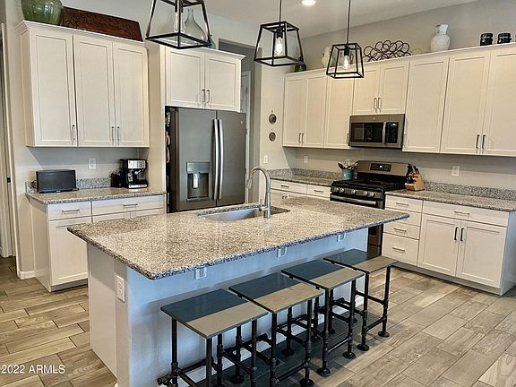 Amazing single level 4 bed, 2.5 bath home located in Marley Park! Lower electric bills with owner owned solar! Upgraded farmhouse kitchen, large kitchen island , granite counters, large pantry and all appliances. Plantation shutters, large ceiling fans and faux wood look tile throughout. NO carpet. Primary bedroom split apart from the rest of the bedrooms . Spacious Primary bedroom has walk-in closet. Primary bath has walk-in shower, double vanities and toilet room. Jack and Jill laundry . Fully turfed back yard with your own putting green. Large covered back patio. Hanging garage storage. Access to 3 community pools, with one right around the corner! Marley Park offers many amenities including parks, community pools and club house access. Close to schools, Loop 303 and shopping. $50 non-refundable application fee per adult. Tenant to verify all pertinent facts. Pet welcome with landlord approval. No aggressive breeds please.