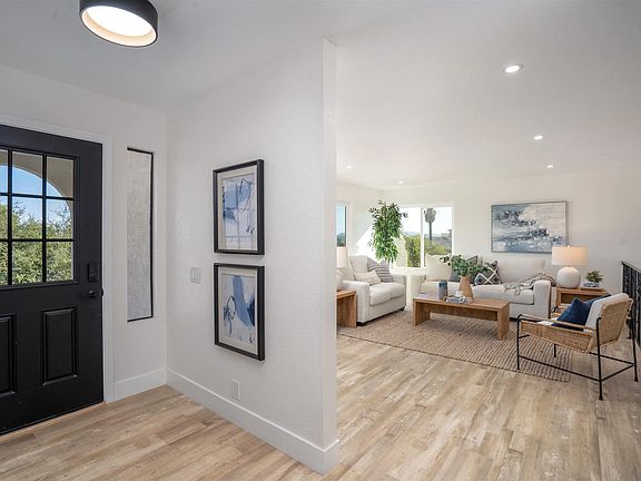 Welcome to Your Modern Retreat in North Escondido! Don’t miss this rare opportunity to own a beautifully redesigned, single-level home nestled in the hills of North Escondido. Sitting on an elevated, private lot with panoramic views and clean desert-style landscaping, this fully remodeled gem offers both tranquility and striking curb appeal. Step inside to discover a bright, open floor plan filled with natural light, LED recessed lighting, and luxury vinyl plank flooring throughout. The spacious living room centers around a sleek quartz-tiled fireplace. It flows seamlessly into the dining area and show-stopping kitchen, complete with quartz countertops, white shaker cabinetry, stainless steel appliances, designer tile backsplash, and matte black fixtures. Enjoy four generously sized bedrooms, including a stunning primary suite with a custom spa-style bathroom featuring marble-patterned tile, a frameless glass shower, and dual vanities. The secondary bathroom has also been thoughtfully updated with premium finishes and dual sinks. Step outside to your private backyard oasis, featuring a concrete patio, lush grassy area, and an upper balcony perfect for entertaining or relaxing, with breathtaking sunset views. Additional upgrades include a brand-new HVAC system with floor-level vents for optimal airflow, dual-pane windows, upgraded lighting and chandeliers, contemporary ceiling fans, and an attached two-car garage. Located in a quiet neighborhood just minutes from shopping, dining, and freeway access, this move-in-ready home checks every box.