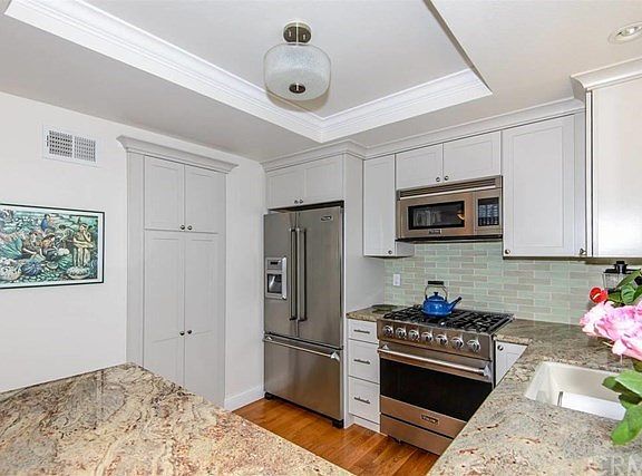 Welcome to the Gardens, San Pedro's premier townhome community. This large 2 bedroom, 3 bath home has been updated and remodeled and it is ready for its new owner. This unit is situated in the back of the complex where one can enjoy a tranquil setting. The kitchen went through a complete overhaul within the last two years with new granite counter tops, beautiful wood cabinetry with soft close hinges, shining wood floors, gleaming chrome fixtures, and sparkling Viking range, Viking refrigerator/freezer and Viking convection/microwave oven. A custom archway lending into the dining room was designed by the current owner to give the room a unique touch. In addition, the three bathrooms have been updated with designer vanities and flooring. The patio with an inviting spa has gone through a transformation to resemble a stunning Hawaiian paradise. All this plus a two car garage with laundry hookups, newer A/C and heating system and an additional dedicated parking space for this unit is included.