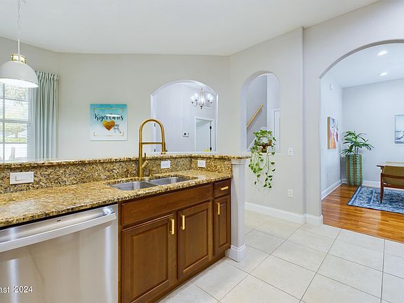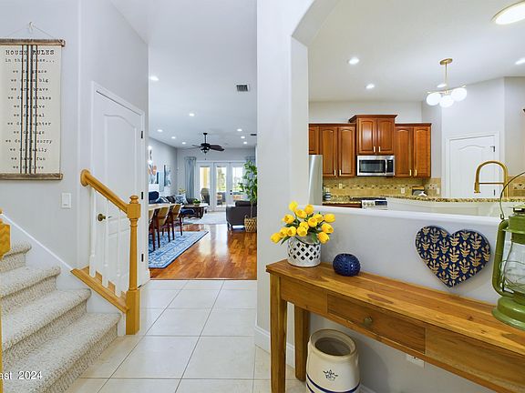 Nestled in one of the most sought-after areas, this stunning 4 bedroom - 3 1/2 bath home offers luxury living with a tranquil lakefront view. The open-concept living area boasts natural light, with high ceilings, and a charming galley kitchen allowing for easy meal prep. The spacious primary bedroom is located on the first floor for added convenience. The adjoining primary bathroom is equally impressive, featuring a luxurious soaking tub, walk-in shower, and dual vanities. Additionally, the home boasts a versatile loft space upstairs with 3 additional large bedrooms and 2 full-bathrooms; featuring a rare second primary suite, perfect for multi-generational living or hosting guests. Enjoy the views of the lake from your upstairs balcony or inside your screened in patio on the first floor. This is a must-see home situated in a quiet cul-de-sac with stunning lake views and a community fishing dock out your front door - near all the Viera shops & located in the Viera School District!