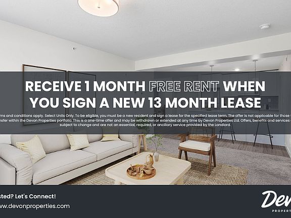 AboutReceive 1 Month FREE RENT When You Sign a New 13 Month Lease. Select Units Only.Discover one of Kelowna's newest rental communities. 280 homes with contemporary designs, integrated built-green technologies, and inspiring shared spaces. Home to our five-building urban residences, Mission Flats offers a resort-like community with spacious apartments and townhomes for you to call home. Our residences feature open plans layouts with contemporary kitchen islands, quartz countertops, stainless steel appliances, and master bedrooms with ensuites or walk-in closets. To be eligible, you must be a new resident and sign a lease for the specified lease term. The offer is not applicable for those who transfer within the Devon Properties portfolio. This is a one-time offer and may be withdrawn or extended at any time by Devon Properties Ltd. Offers, benefits and services are subject to change and are not an essential, required, or ancillary service provided by the Landlord.