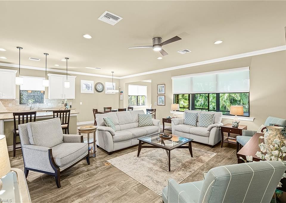 A Rare Gem in Water’s Edge – Unmatched in Design and Features! This exquisite turnkey-furnished residence, built in 2015, is a true standout in the highly sought-after Water's Edge Marina subdivision. This Abbeyville model is meticulously maintained, it offers an unparalleled blend of sophistication and comfort, boasting spectacular upgrades and designer furnishings (Ethan Allen, Robb & Stucky etc) that convey - setting it completely apart from other homes in the development! Step inside to a home that feels fresh and brand-new. The spacious layout features an amazing floor plan with an open kitchen, large living room, a bright sun room, 3 bedrooms, 2 baths, a generously sized 2-car garage, and an oversized screened lanai offering exceptional privacy - perfect for relaxing or entertaining. There is sufficient room to add your dream pool, but it only takes 1 minute to access one of the two community pools! The gourmet kitchen is a showstopper, featuring a striking central island with quartz countertops, luxurious cabinetry, high-end stainless steel appliances, beautiful backsplash, and modern lighting that enhances the home's elegance throughout. The living room immediately impresses by its furnishings, decor, high end blinds and smooth flow to the kitchen and formal dining area, again boasting the most exquisite furnishings and lighting accents. Luxury tile flooring throughout, complemented by carefully curated furnishings and abundant natural light. Custom laundry room with high end appliances and cabinetry. Retreat to the serene "master suite" that already stands out by its amazing lighting fixtures, beautiful tray ceilings, design and comfort, completed with a spa-like ensuite featuring a gorgeous shower, dual sinks, and a spacious walk-in closet. A private water closet enhances comfort and privacy. This exceptional home is loaded with upgrades, please see the attached upgrade sheet for a full list. All impact glass windows and doors add to comfort. ***** AMENITIES ***** This waterfront community boasts a private marina with DIRECT GULF ACCESS, 2 community pools, tennis & pickle ball courts, a private beach & amazing sunset views of the river. LOW HOA dues! Minutes to restaurants, shopping, entertainment and to beaches. Enjoy a relaxed lifestyle! Elevation is over 9 feet, Flood insurance transferable. WELCOME to PARADISE!
