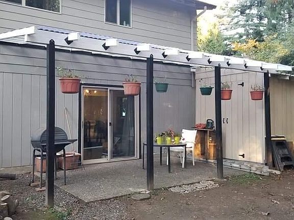 Side yardCovered patioElectric hot burnersPatio tableCounter spaceDouble kitchen sinkParking spot in driveway