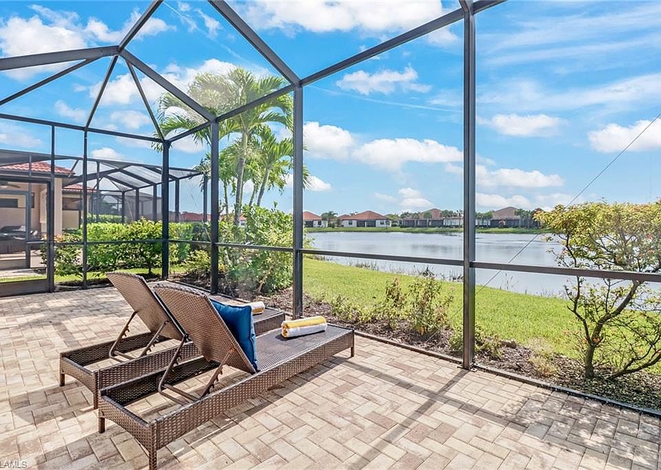 Listed below appraised value! Amazing Sunrise views from this 2 bed +den, 2 bath, 2 car garage single family home lakefront. Desirable Medina Floor plan that was constructed by WCI offers an open floor concept. Home is immaculate. The spacious kitchen offers a large island, dark brown cabinets, granite counters, mosaic tile back splash and whirlpool stainless steel appliances. Interior recently painted. Main Bedroom has an oversized picture window to enjoy the beautiful wide lake view. The Ensuite offers double vanity with granite counters and a walk in shower, also features a large walk in closet with custom shelving. The split floor plan allows for privacy with other guest rooms on other side of the home with a full bath featuring a shower/tub combo and single vanity. Your oversized screened in patio offers a nice overhang to enjoy outdoor dining even in the rain, or enjoy sunbathing on the extended lanai overlooking a large lake. Hurricane impact windows and triple sliders for your patio doors for better panoramic views. Artesia offers an array of amenities overlooking a grand lake. Close to shops, restaurants and beaches in Naples. Appraisal upon request.