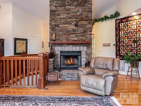 soaring cathedral ceilings, a floor-to-ceiling stone fireplace, and a gourmet kitchen with high-end