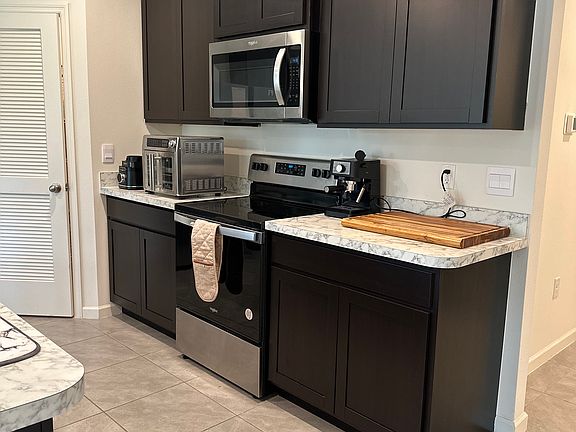 Kitchen: Stainless steel refrigerator, stove, microwave, and dishwasher