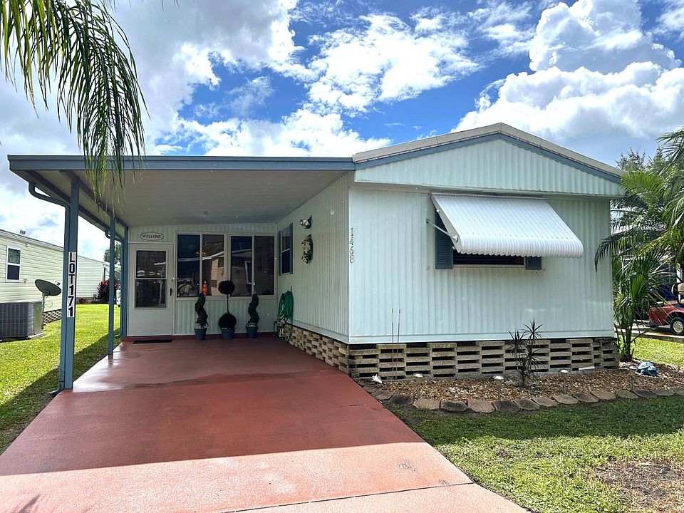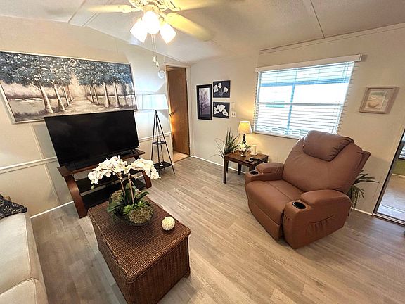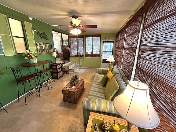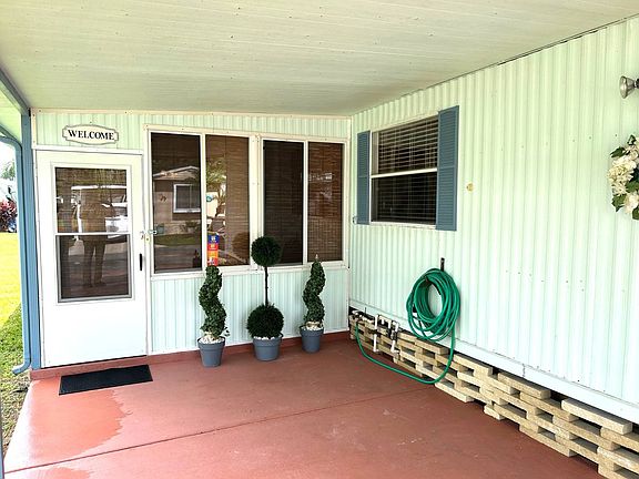 Beautifully remodeled 2-bedroom, 1-bathroom home offering 616 sq. ft. of comfortable living space. This fully furnished, turnkey home is move-in ready and tastefully decorated throughout. The spacious Florida room features a brand-new AC unit and sleeper sofa-perfect for guests or relaxing year-round. Enjoy new laminate flooring in the living room, a new stainless-steel refrigerator, and plenty of storage with two sheds. The large, covered carport and hurricane awnings provide added protection and convenience. Located in a beautiful 55+ community with a sparkling pool and clubhouse, you'll love being just 5 minutes from Walmart, Publix, medical facilities, and popular dining spots like McDonald's and Wendy's. This charming home has it all-style, comfort, and location!