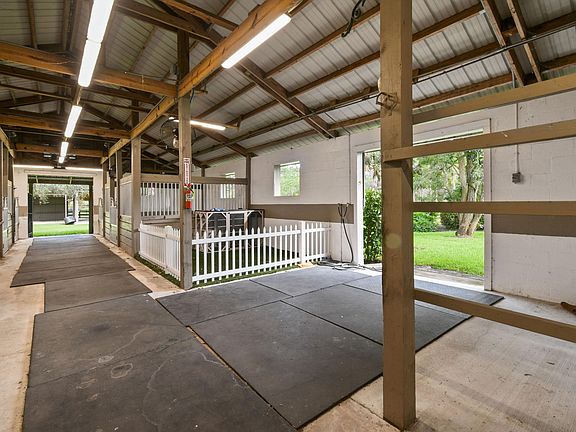 - Horse amenities: Boarding Allowed, Bridle Path/Trails, Center Aisle, Feed Room, Fly System, Grass Field, Grooms Quarters, Owners Apartment, Paddocks, Regulation Dressage, Ring, Stable, Tack Room, Wash Rack(s), Water & Electric, Stall, Barn