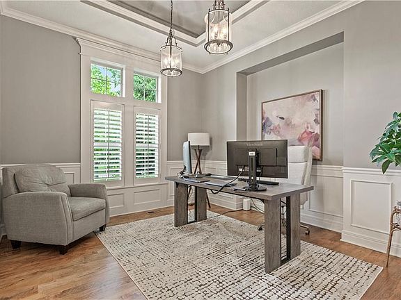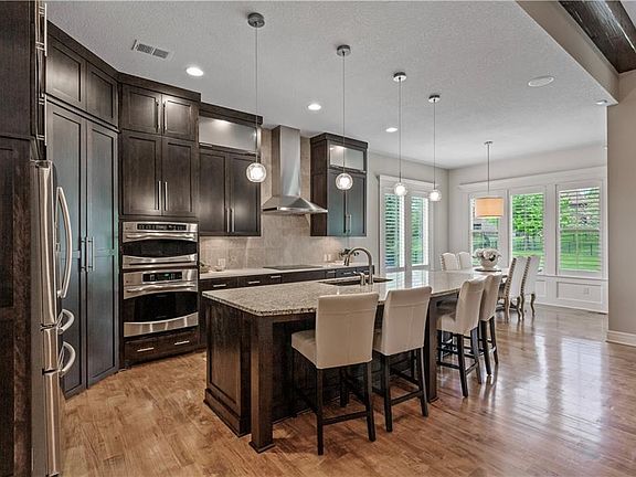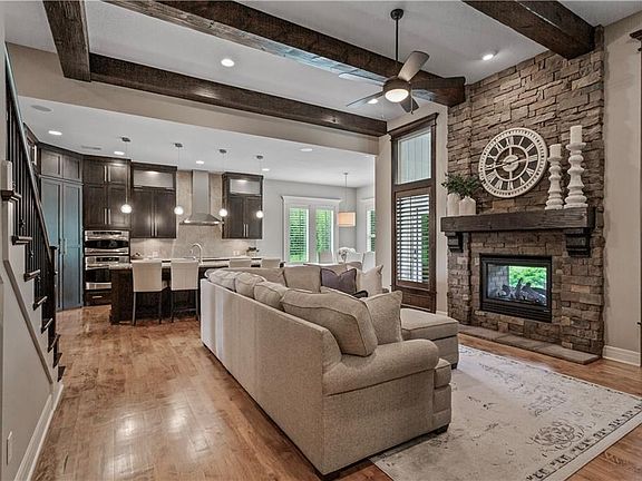 Don’t miss this meticulously maintained 1.5 story James Engle custom home on a quiet cul-de-sac lot in the Blue Valley School District! Open concept floorplan with a beautiful arched entry into the great room, kitchen, and dining area boasts soaring ceilings, wood beams, custom interior shutters throughout entire first floor, home audio system, and upgraded maple hardwood flooring. The grand kitchen features upgraded ceiling-height cabinets, an oversized island, stainless appliances, large walk-in pantry with workspace, and a butler’s pantry with additional cabinet storage and beverage fridge. Luxurious primary suite features a second, private entrance to the covered outdoor patio via custom French doors and custom interior shutters. The ensuite features a spa-like walk-in shower with dual shower heads and a rain shower, double vanities, and luxurious tub. Ensuite leads to large custom walk-in closet with full-sized mirror, built-ins, and laundry room access. Secondary bedrooms are all very spacious with one bedroom having its own private ensuite and the other two sharing a Jack and Jill bathroom. All bedrooms feature large, walk-in closets. In the front yard you’ll find an inviting curb appeal with custom landscaping and covered porch. In the back yard, there’s a covered patio with see through fireplace and a second, uncovered, patio that you’ll find perfect for outdoor entertaining. You’ll enjoy additional privacy with the custom landscaping around the back patios. The yard is large and fenced in, with a water spigot extended to the far backyard for future gardening endeavors. Additional upgrades: Finished stairway to downstairs, maple hardwoods that extend to upstairs level, built in shelving and hanging storage in garage, wired for carriage lights on backside of covered patio.