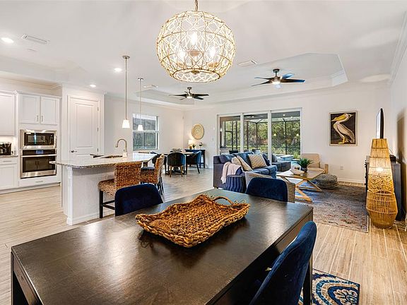 Experience true resort living in this fabulous Executive pool home at Heritage Landing Golf & Country Club. Curb appeal abounds from this three year old home boasting a side load garage and surrounded by pleasing vegetation. Step into relaxed sophistication with this furnished, move-in-ready home, which includes a highly sought-after DEEDED GOLF MEMBERSHIP to the Gordon Lewis designed course. Nestled along a quiet preserve for maximum privacy and peaceful views, this home offers the best of Florida living—inside and out. A striking open floorplan welcomes you inside with stylish wood-look tile flooring and volume ceilings embellished by multiple tray insets and finished with crisp crown moldings throughout. Surround yourself in sunshine and pleasing breezes through the abundant impact windows and doors throughout the home. This open-concept kitchen will be a great gathering spot for your gang, featuring an expansive island with ample seating, stone countertops, stainless steel GE appliances including a wall oven/microwave combo, cooktop stove, and under-cabinet lighting that adds a warm glow to the space. The spacious great room, with expansive sliding doors, flows seamlessly into the covered lanai, where outdoor living truly shines. Entertain with in style with the handsome summer kitchen complete with built in stainless grill, stone countertops, refrigerator, stacked stone accent wall, and stainless grill hood. The expansive paver pool deck surrounds a sparling pool and spa, with ample deck space for lounging or hosting a get together. A dedicated pool half bath adds extra convenience. The primary suite is a tranquil retreat, with sliders to the lanai, dual walk-in closets, and a spa-inspired bath featuring split vanities, stone counters, a walk-in shower, and private water closet. A separate guest wing includes another bedroom, full bath, and utility room, offering privacy for visitors. A versatile 3rd bedroom/den with double doors can serve as a home office or a third bedroom. As a resident of Heritage Landing Golf & Country Club, you’ll enjoy access to fabulous amenities, including a Championship 18-hole golf course, Har-Tru tennis courts, pickleball, fitness center, sauna, day spa, multiple pools, tiki bar restaurant and brand new clubhouse restaurant,. All of this certainly will lend itself to enjoying the resort lifestyle you have been dreaming about.