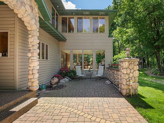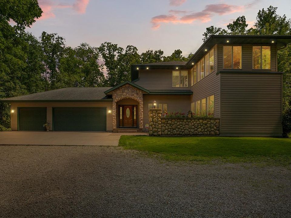 Step into this extraordinary 10-acre private oasis offering a tranquil country setting. This meticulously maintained custom-built home boasts stunning main-level features including vaulted ceilings, floor-to-ceiling windows with breathtaking views, a spacious kitchen with custom cabinets and hard surface countertops, a striking stone fireplace, an office, main-level laundry, and a wet bar. Upstairs, the master bedroom is a luxurious haven with a spacious bathroom featuring a jacuzzi tub, tiled shower, walk-in closet, balcony, and a spare hot tub room for ultimate relaxation. The lower level features a large family room with a cozy cabin feel, a sauna, wet bar, another beautifully tiled shower, and a generously sized bedroom. Step outside to discover a beautifully landscaped lawn with an immaculate flower garden, a heated 3-stall garage, a garden shed, a paver patio with a fountain, maintenance-free siding, stunning stone pillars, a walkout patio, and a firepit, all complemented by a 24x36 pole building. Situated on prime hunting grounds, this sanctuary spans 10 acres and boasts 2 heated tower blinds- one with electricity, tree stands, food plots, a pond, and a rich history of 140+" bucks and trophy toms. The property adjoins 110 acres of public land, ensuring an unparalleled hunting experience. 40 +/- acres butting up to the property does not allow hunting, making it a nice sanctuary around the 10-acre property! The location is also exceptional, conveniently located on blacktop, close to lakes, renowned restaurants, public land, and just minutes from major highways. This property truly has it all! Schedule a showing today and experience the epitome of luxury living.