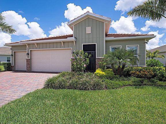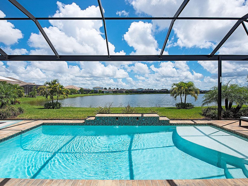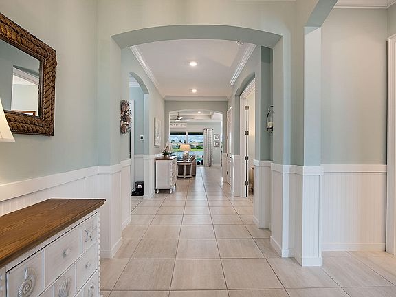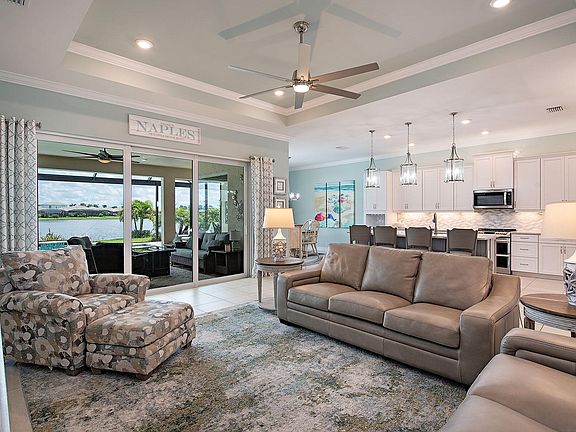Exquisite Wheaton floor plan in sought after Naples Reserve. This gorgeous waterfront home starts off with a charming foyer, shiplap walls and double tray ceilings. The custom lighting, ceiling fans, crown molding and 24'' tile create an exceptional living environment. The upgraded kitchen has custom tile backsplash, granite countertops and stunning white cabinetry. This includes a wine refrigerator, upgraded appliances and a spacious walk-in pantry with custom lighting. Upgrades abound in this home include French doors, custom designed closets throughout the home, high end exterior lighting, whole house generator and more. The beautiful lanai includes a spacious sundeck, waterfall pool, custom outdoor kitchen, lanai lights, propane fire pit and upgraded landscaping. The picture view screen allows for elegant, long water views. Storm Smart shutters are also included. The 3 car garage has overhead storage and finished floors. Naples Reserve is an exceptional new community with Pickleball, Tennis, Lagoon style Pool with additional Lap feature. Great fitness center and owner access to watercraft for the lake area. A delightful environment.