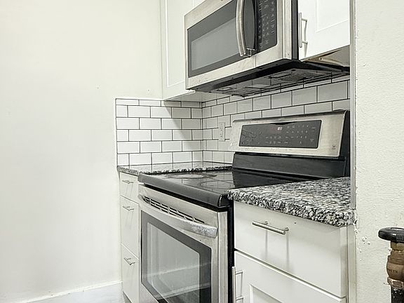 Remodeled kitchen with stainless steel appliances, subway tile backsplash, and new countertops