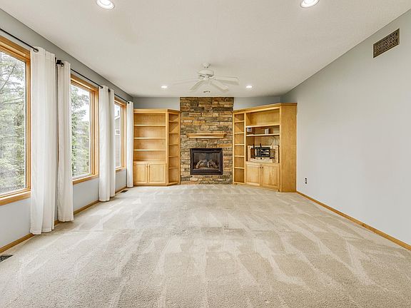 This stunning home is filled with wonderful features. Located next to the Rice Lake Chain of Lakes Regional Park, within walking distance to two accesses. There's seemingly unlimited acreage, area lakes, and trails to enjoy. So many opportunities for making great memories. This home features high ceilings and an abundance of windows, giving this home a bright and open feel. The four season Porch will be your favorite room. Step out onto the refinished deck, and be surrounded by wildlife and nature. The land behind the home will remain natural, giving you the ultimate in privacy. The Kitchen features a built-in wine rack, stainless steel appliances, and plentiful cabinet and countertop space. The large center island offers additional storage and pendant lighting. Spend evenings relaxing in the elegant Living Room, in front of the stone fireplace. The main level has a bright home Office and 1/2 Bath. The upper level features a Primary Bedroom Suite. Step into your own private retreat: a soaker tub, separate tile shower, and double sinks. Includes a very generously sized walk-in closet. The Primary Bedroom features a beautiful tray ceiling and wonderful backyard views. There are three additional Bedrooms on this level and a second Full Bath. The lower level is bright and open, and features a great wet bar and Family Room with a fireplace. The perfect space for entertaining family and friends. The 5th Bedroom features a stylish and functional Murphy Bed. This home and yard are a must-see. Across the street is a "hidden park" for kids to play and where you can walk your dog. It's connected to the walking paths, just one more wonderful feature. Don't miss the chance to make this great home yours!