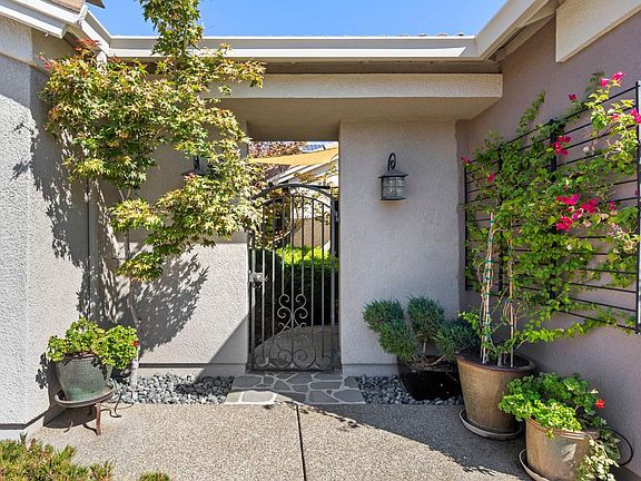Enjoy exceptional living in this stunning Fremont Model home with a detached casita with full bath. This property was featured on the Sun City Lincoln Hills community garden tour, showcasing an expansive backyard designed by the locally renowned High Hand Nursery. It offers a true outdoor oasis with a private gated entry, inviting courtyard, soothing pond, fountain, mature trees, and low-maintenance artificial turf. Inside, you'll find elegant details including birch wood floors and a recently renovated living area featuring a stacked stone fireplace with hearth, complemented by floating shelves with rope lighting, and high-end surround sound speaker system. The gourmet kitchen features maple cabinets, granite counter tops, stainless steel appliances, center prep island with wood top and pantry cabinet. Cabinets include convenient pull-out shelving, and both bedrooms feature closet organizers. The master suite provides outside access and boasts a beautifully renovated bath with a large walk-in tiled shower, dual sinks, and decorative mosaic tile floor. The expanded 2.5-car garage is immaculate with epoxy flooring, overhead & attic storage, and a workbench. Added value comes from OWNED solar, a newer HVAC system, and a newer water heater. This home is special!