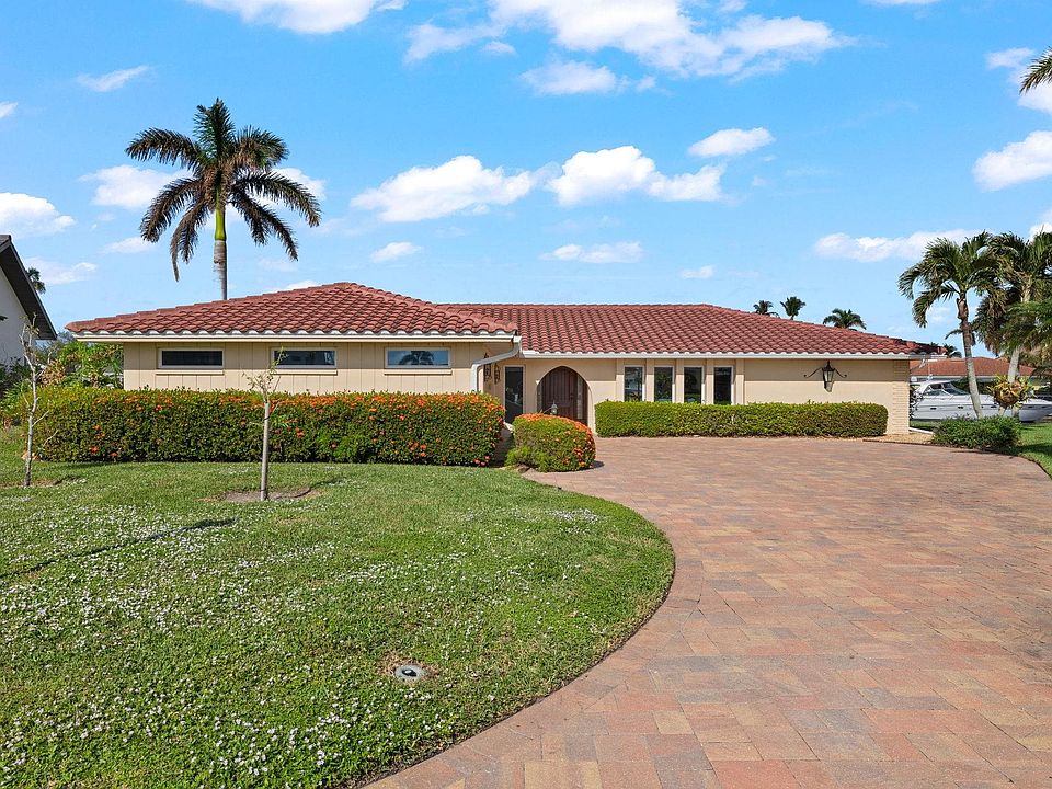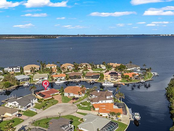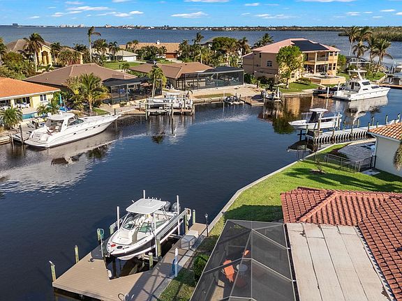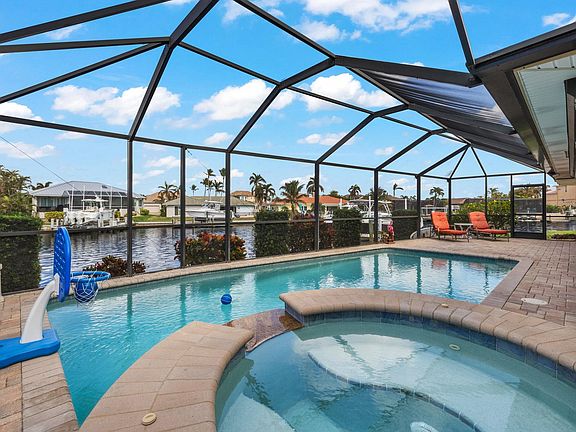 Experience the best of deep water living in Palm Acres, near Sanibel Island. Enjoy breathtaking views of tidal waters, sunsets, manatees, and dolphins. The property features 140 ft. of seawall, a walk-around composite dock, a remote-controlled 10,000 lb. boat lift, and a floating dock for kayaks or paddleboards. Inside, the remodeled open floor plan boasts a kitchen with quartzite counters, under-cabinet lighting, and a breakfast bar opening to the family room. The split layout includes a spacious primary suite with canal views, pool access, a walk-in closet, and en-suite bath, along with three additional bedrooms—one ideal for a home office or flex space. Tile floors, crown molding, and impact-rated windows add to the home's durability and charm. Outdoors, the saltwater pool and spa, added in 2013, are solar heated for year-round enjoyment. This home is the perfect blend of elegance, functionality, and waterfront lifestyle.