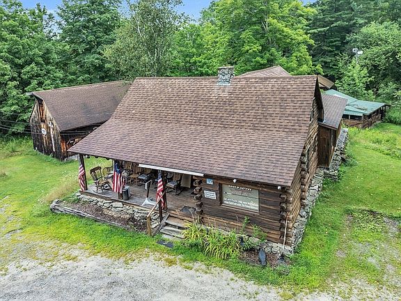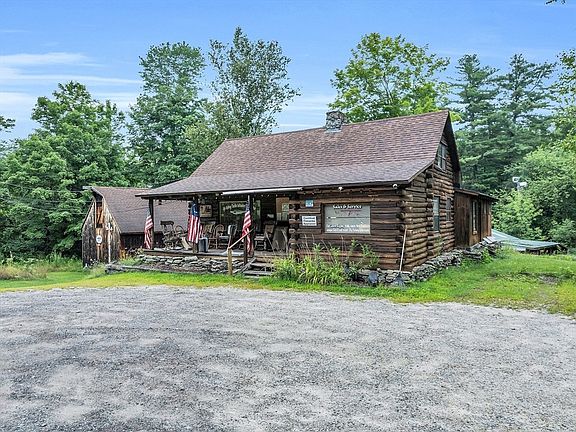 Priced below assessed value this large property situated on 5.6 picturesque acres has multiple buildings including a log cabin (currently used as a sporting goods store), huge 2 story barn with adjacent heated room (former art gallery), bunkhouse with a wood stove, and rustic 2-stall horse barn. Log cabin features flexible floor plan. There are 5 rooms on the first floor with fieldstone center fireplace. The second floor has a kitchenette, bathroom with shower, and 2 additional rooms with gable walls. Large walk-out basement is ideal for storage and workshop. Property is zoned as rural residential with grandfathered right for business use. Enjoy the convenience of circular driveway with ample parking. Brand new 4-bedroom septic system. The property needs updating and sold as is. Researching the potential for subdivision of land is buyer's responsibility.