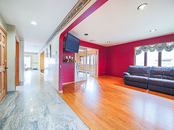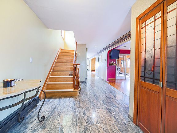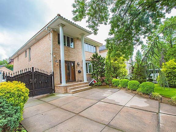 Welcome to this gorgeous & spacious custom built brick home with new terracotta tiled roof. This gem features 5 bedrooms 2 full bath 2 half bath. Building size is 2750SF. Huge lot size 4920SF. Large master bedroom with full bath & walk-in closet. Family bathroom with 2 person jetted tub, floored attic. Kitchen with granite countertops and matching custom table. Formal dining room with french doors & custom window treatments, large living room with bay window & custom window coverings, fully finished basement (entire length of house) with terazzo floors, and seperate entrance, large organised pantry. Pool with pavers, great schools, walking distance to express bus to Manhattan, sprinklers, alarm, and security cameras, central AC 4 zone heating. Central Air Conditioning. Private driveway & Detached Garage can park 6-7 cars. 1.5 car garage with extra storage.