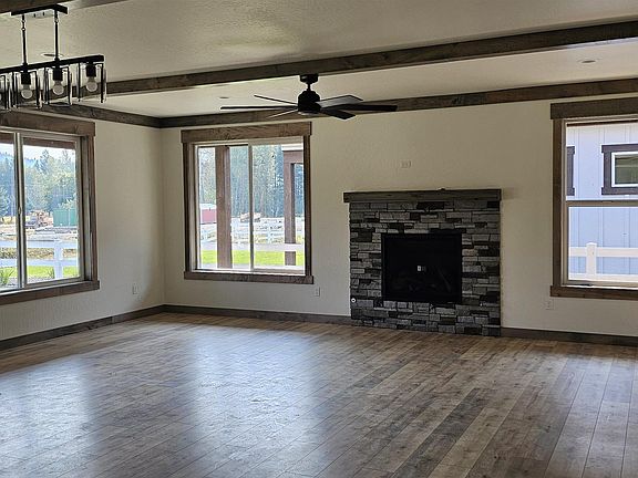 The Blacktail - Elegant Single-Level Living with Mountain Views Experience refined comfort in this 3-bedroom, 2-bathroom, 1,938 sq ft home featuring a stunning 1,200 sq ft wraparound porch with tongue-and-groove soffits and French doors—perfect for soaking in year-round mountain views. Inside, enjoy an open floor plan filled with natural light, luxury laminate plank flooring, and a cozy gas fireplace. The retreat-style primary suite includes a tiled walk-in shower, double vanity, linen storage, and a walk-in closet with built-ins. The gourmet kitchen boasts a large granite island, walk-in pantry, GE Profile appliances, and custom cabinetry throughout. Additional highlights include a landscaped lawn with sprinklers, a 3-car garage, and a durable 50-year composite shingle roof. Whether you're seeking a full-time residence or a vacation escape, The Blacktail offers elevated living with premium finishes in every corner.