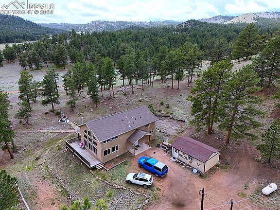 Discover Your Mountain Paradise: a stunning 2,011 square foot two-story retreat that captures the beauty and serenity of Colorado mountain living. With an open floor plan and a versatile loft design, this home offers two bedrooms and two bathrooms, perfectly crafted for comfort. Step inside and be captivated by the expansive great room. The 22 ft. ceilings and floor-to-ceiling windows frame the breathtaking views, ensuring you'll never miss a moment of the wildlife that frequents the property. Whether it's deer, chipmunks, or the diverse bird species, nature is always within sight. The lower level features a cozy bedroom equipped with a jacuzzi tub and a spacious walk-in closet with ample storage. Upstairs, the loft can serve as a master suite or an additional living space, offering flexibility to suit your needs. Adjacent to the main house, you'll find a charming Additional Dwelling Unit that has been a delightful sleeping space. It is ideal for guests and offers potential as a vacation rental, hobby space, or quiet home office. This home is nestled on 20 acres of rolling hills and majestic ponderosa pines, with an abundance of wildflowers that paint the landscape in vibrant colors from summer through fall. This nature lover's haven is home to over 80 species of birds, making it a paradise for birdwatchers and wildlife enthusiasts alike. Fitness and recreation are at your doorstep with a professionally designed 20-basket disc golf course. Enjoy it as your private retreat or leverage it as an attraction for a unique business opportunity. Embrace the unparalleled beauty and endless possibilities of this incredible property. Take the reins and transform this stunning home into your very own mountain paradise.