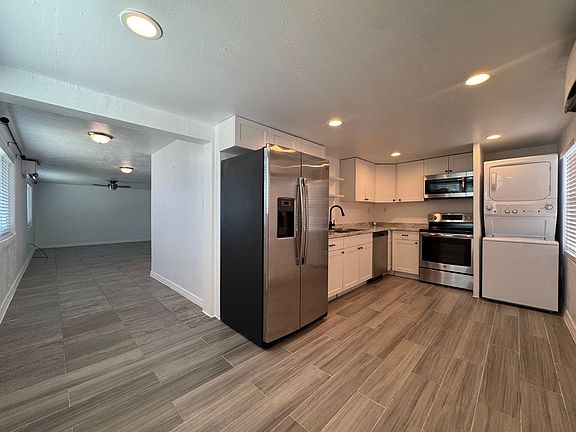 Ceiling fansFaux wood blindsStackable washer and dryerNew windowsNew glass shower doorStainless steel appliancesNew white shaker cabinets
