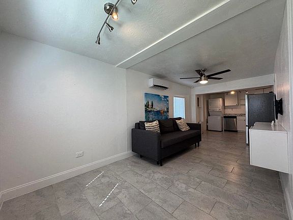 This adorable, remodeled 1 bedroom, 1 bathroom duplex unit is READY for MOVE IN!! This unit has been freshly painted, the NEW windows all have faux wood blinds, and there are ceiling fans in both the living room and bedroom. The kitchen features new white shaker cabinets, granite countertops, and STAINLESS STEEL appliances, along with a stackable washer and dryer. The bedroom is large enough for a king size bed, plus a sitting area and has a large closet with built ins for plenty of storage. The bathroom has a new vanity, new fixture, new tile shower with black fixtures and new glass shower door. This property is efficiently cooled with mini split AC systems. This unit includes water, sewer, garbage and POWER and is within walking distance from the World's Most Famous Beach!!