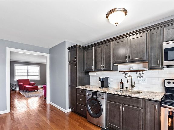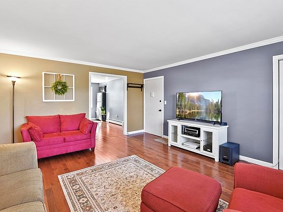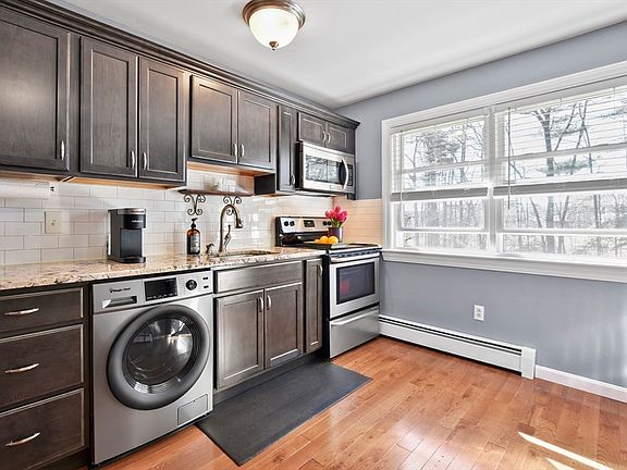 This stunning unit offers gorgeous, upscale finishes at a budget-friendly price. Beautifully updated with high-end touches, fresh paint, and thoughtful design - there’s nothing to do but move right in and enjoy! Step inside to discover a spacious living room with gorgeous hardwood flooring and crown molding which create a warm and inviting atmosphere. The hardwood continues into the kitchen which features granite countertops, stainless steel appliances, and the added convenience of an all-in-one washer/dryer. A recently updated tile bath elicits a spa-like feeling. Each evening, retreat to your tranquil, spacious bedroom with hardwood flooring and overlooking the large yard. This unit boasts the largest backyard in the complex and offers an unparalleled space for outdoor entertaining and enjoyment - gas grills allowed! The condo fee includes your heat and hot water - so utility costs are minimal. Deeded parking and basement storage are included.