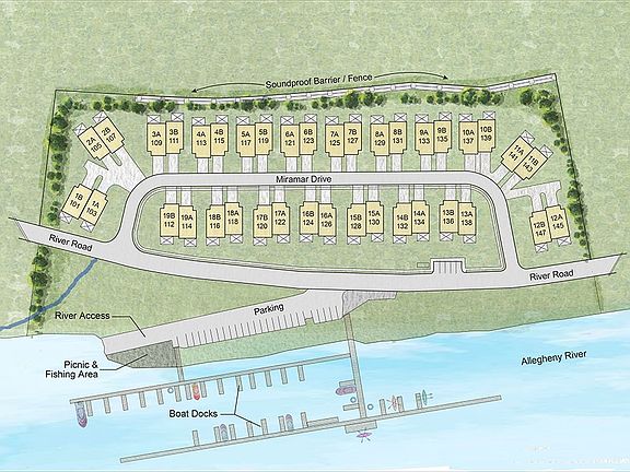 Welcome to Miramar Landings, where luxury meets convenience nestled along the Allegheny River. ELEVATOR OPTION!! MODEL TOURS AVAILABLE! Our upscale residences offer maintenance-free living with exclusive river access and optional dockage. Enjoy contemporary design featuring exterior stone accents, a cozy fireplace, and a covered deck and lanai providing stunning views. Customize your home with options like a finished lower level with extra bedroom/bathroom, study, game room, or even an elevator. Each residence boasts 3 bedrooms, 2 ½ bathrooms, and a 2-car garage, embodying modern comfort and riverfront elegance. Crafted by award-winning Ricciuti Enterprise, our community in O’hara Township, within the Fox Chapel School District, offers proximity to amenities like shopping, parks, country clubs, and dining. With easy access to the Turnpike and Route 28, commuting is a breeze. Welcome home to Miramar Landings, where luxury living meets unparalleled convenience.
