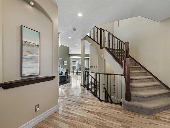 Executive Walkout Home in Coopers Crossing! Discover a home designed for both family living and entertaining in this highly sought-after community, perfectly positioned on a quiet cul-de-sac and backing directly onto walking paths and green space enjoying a sunny south exposure. This executive walkout property offers a rare combination of privacy, functionality, and luxury upgrades throughout. The open concept main floor features soaring ceilings, maple hardwood flooring, a gourmet kitchen, butler’s pantry, gas fireplace, and central A/C. The living room is anchored by dramatic floor-to-ceiling windows extending to the upper level, flooding the space with natural light. The kitchen is as functional as it is stylish, with granite counters, stainless steel appliances, a large center island, and a walk-through butler’s pantry for added storage. The dining area, surrounded by southwest exposed windows, opens to a large rear deck which is perfect for hosting or enjoying tranquil views of the park. A private den/home office and mudroom complete this level. Upstairs, a sweeping curved staircase leads to the luxurious primary retreat, featuring a spa-inspired 5-piece ensuite and a custom walk-in closet. This level also includes two generous bedrooms, a full bathroom, and a convenient upper floor laundry room. The fully developed walkout level expands the living space with a spacious rec room, corner fireplace, games area, wet bar, full bathroom, and an additional bedroom. Step outside and you’ll find a beautifully landscaped southwest-facing backyard (complete with irrigation system) offering sun-filled afternoons, privacy, and direct access to pathways and green space. A covered hot tub area adds the perfect spot to unwind year-round. Additional highlights include a heated double garage, fully finished with insulation, drywall, and epoxy flooring. Beautifully maintained, this home reflects exceptional pride of ownership and is sure to impress. Book your private showing today and experience all that Coopers Crossing has to offer.